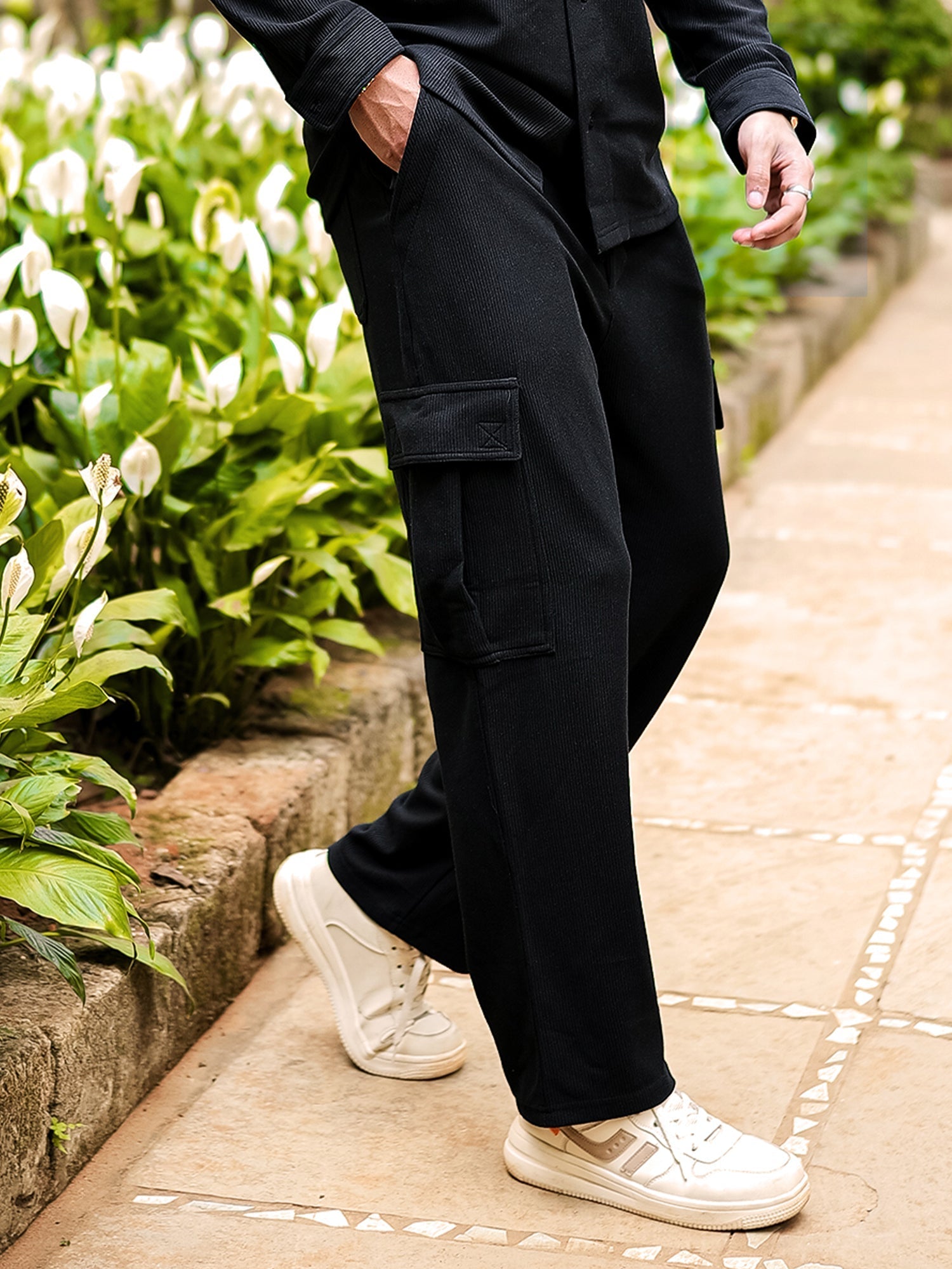 Cord Knit Textured Black Baggy Fit Cargo